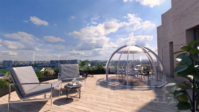 Терраса на 24 этаже под открытым небом с панорамой города, креслами, шезлонгами и всесезонной беседкой только для резидентов.