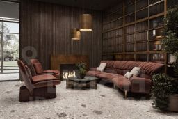 В корпусе расположена зеленая гостиная - полуприватная зона на 2-4 человека с деревянными креслами и диваном, а также детская площадка, интегрированная в сосны.