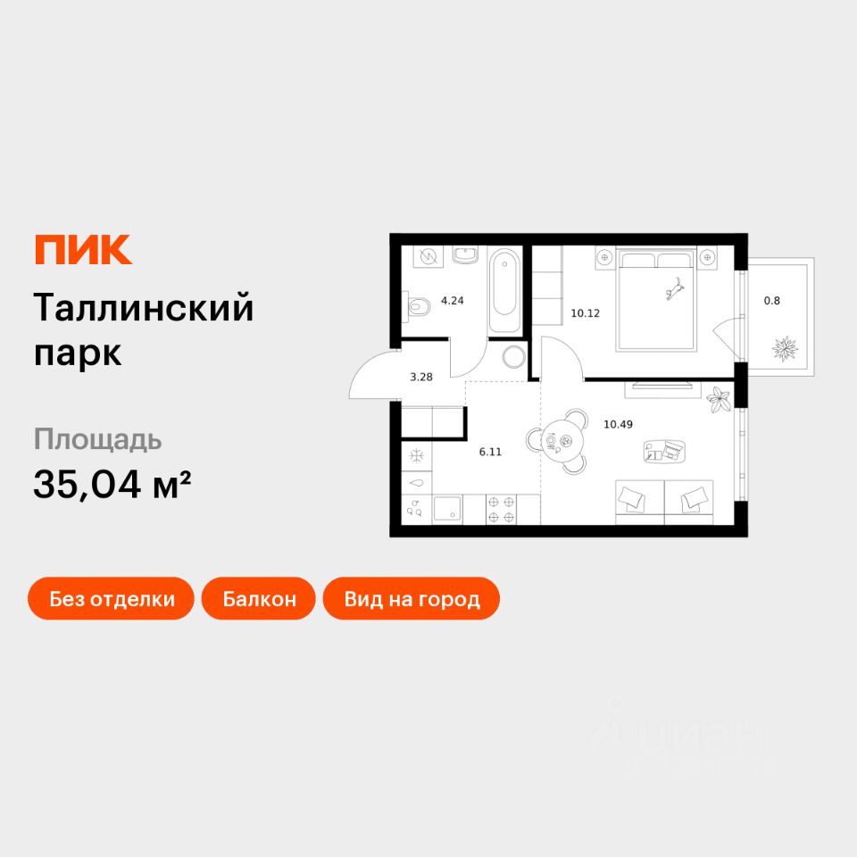 Продаётся 1-комн. квартира площадью 35,04 кв.м на 4 этаже 12 этажного дома (Корпус 4.1, Секция 1) проекта ПИК Таллинский парк. Светлый просторный подъезд на уровне земли, функциональная планировка, большие окна, без отделки.