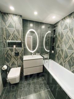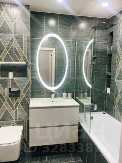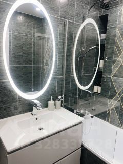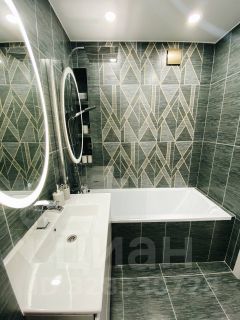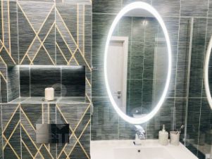 В санузле гарнитур и встроенный шкаф выполнены под заказ по индивидуальным параметрам. Большое настенное зеркало с фронтальной подсветкой и сенсорным управлением визуально увеличивает пространство ванной комнаты.