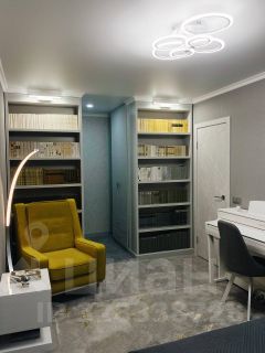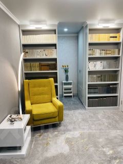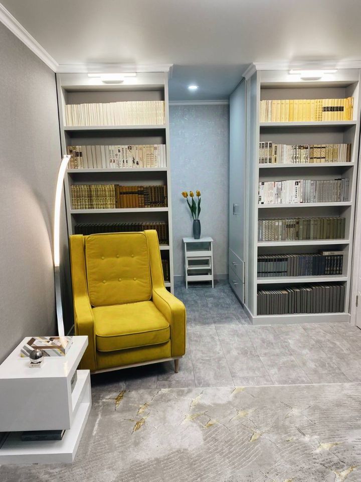Вход в кабинет-гардеробную оформлен книжными шкафами от пола до потолка. Шкафы выполнены под заказ. Вместительный платяной шкаф в потолок имеет комбинированное наполнение: антресоли, полки, комодные ящики.