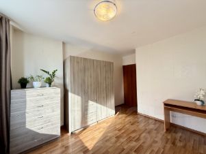Будущему владельцу остаётся вся мебель и техника: это кухонный гарнитур, спальное место, шкаф для хранения вещей, комод, плита с духовым шкафом, холодильник и стиральная машина.