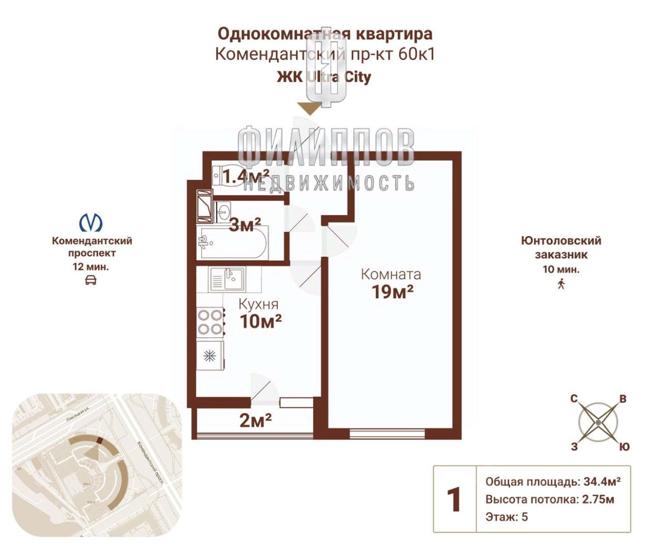Видовая 1-к квартира с мебелью и техникой в ЖК Ultra City