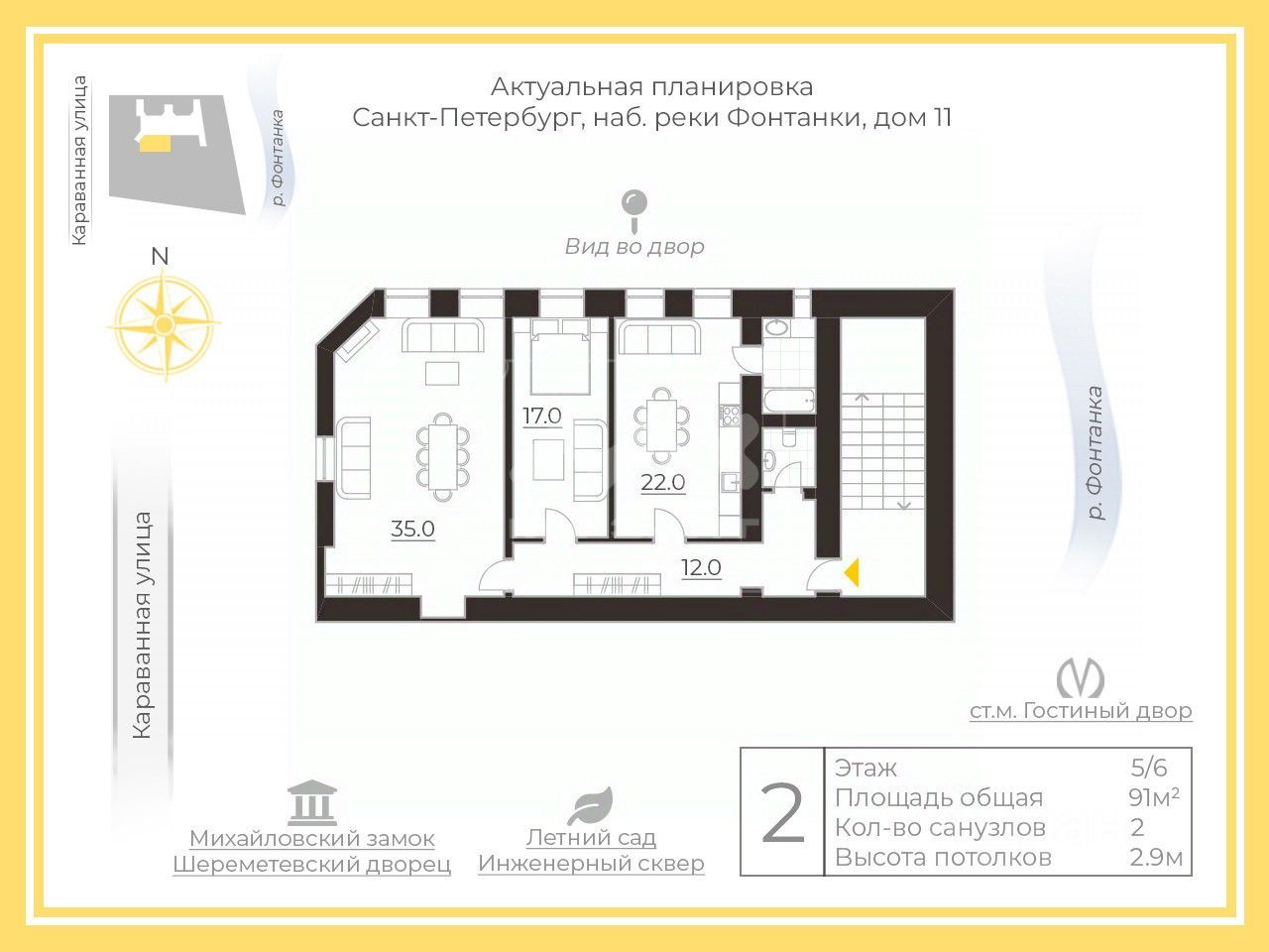 Квартира просторная, с удобной планировкой: общая площадь 90м2, две изолированные комнаты и просторная кухня-гостиная. Вид в отреставрированный светлый двор, за счет предпоследнего этажа видно небо, 5 окон (и одно маленькое в ванной) наполняют квартиру светом и воздухом.