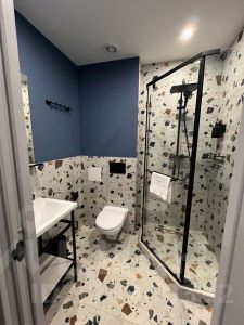 По цветовой гамме отделки номерного фонда используются два варианта основных цветов синий или оливковый.