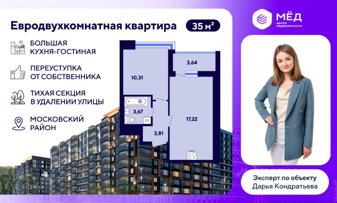 - Общая плoщадь - 35,64 кв.м + лоджия 3,64