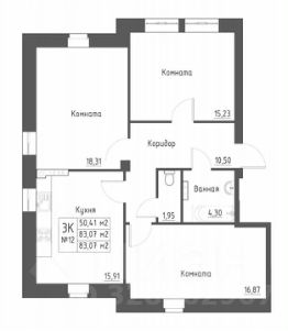Большая кухня (15.91 м.кв.), и три изолированные комнаты (18.31 + 16.87 + 15.23 м.кв.), раздельный санузел и просторная прихожая.