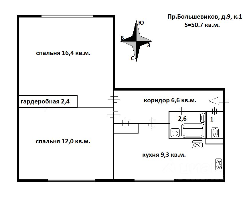 Площадь: 50.7 кв.м. Комнаты 16,4+12,0 кв.м. Просторная кухня с зонированием (отдых и приготовление пищи), изолированные комнаты.