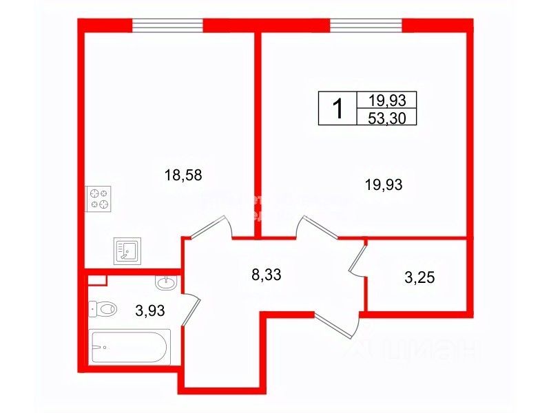 Квартира общей площадью 53 м2 — это по-настоящему просторный формат 1-комнатного жилья. Продуманная планировка включает большую кухню-гостиную 18,58 м2, где удобно проводить время с семьёй и принимать гостей, а также отдельную комнату 19,93 м2 с возможностью зонирования. Большая гардеробная
