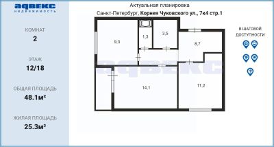 Общая площадь квартиры составляет 48,1 квадратных метра. Комнаты площадью 11,2 и 14,1 кв.м. Кухня занимает площадь 9,3 кв.м. Квартира находится на 12 этаже 18-этажного панельного дома, построенного в 2016 году. Санузел раздельный. Потрясающий вид из окон.