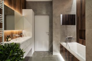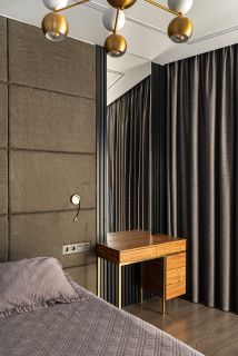 В отделке использованы только качественные материалы: натуральный камень, премиальная плитка, дорогие породы дерева, сложные фактуры. Кондиционер, теплый пол поддерживают качественный микроклимат в квартире.