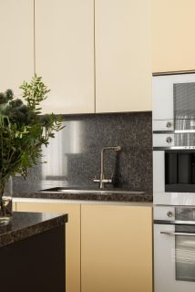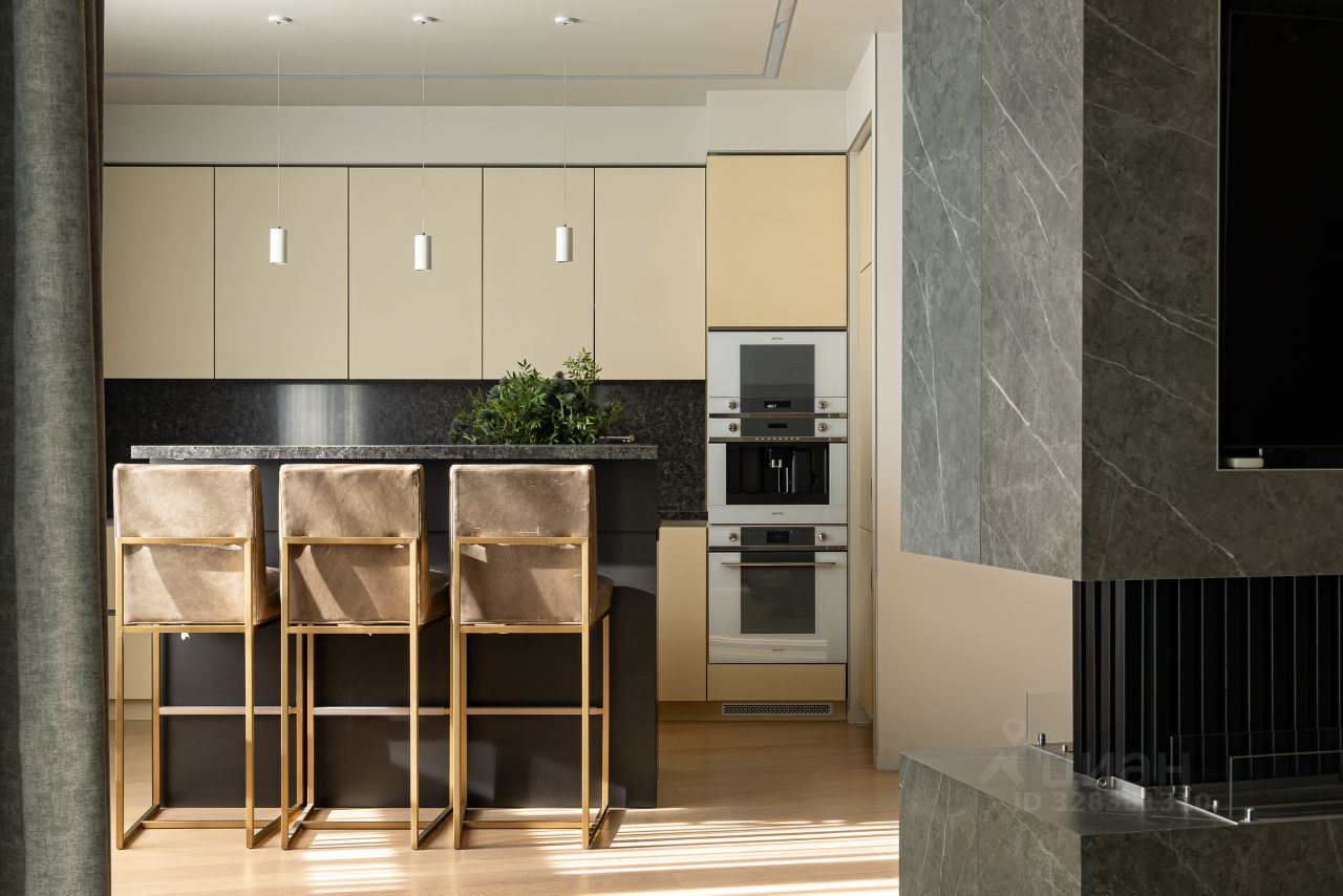 Вас встретит просторная кухня-гостиная - сердце этой квартиры. Здесь установлен биокамин, который создает атмосферу уюта в любое время года. Вся квартира оснащена техникой премиум-класса Smeg.