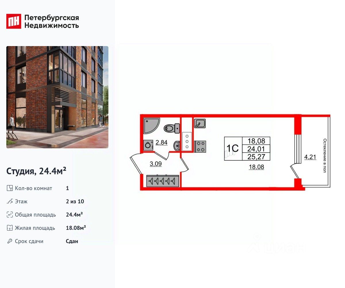 Удобная, классическая, функциональная европланировка, вместительная прихожая 3.09 м². Общая площадь студии - 24.4 м², жилая 18.08 м², высота потолка 2.77 м.