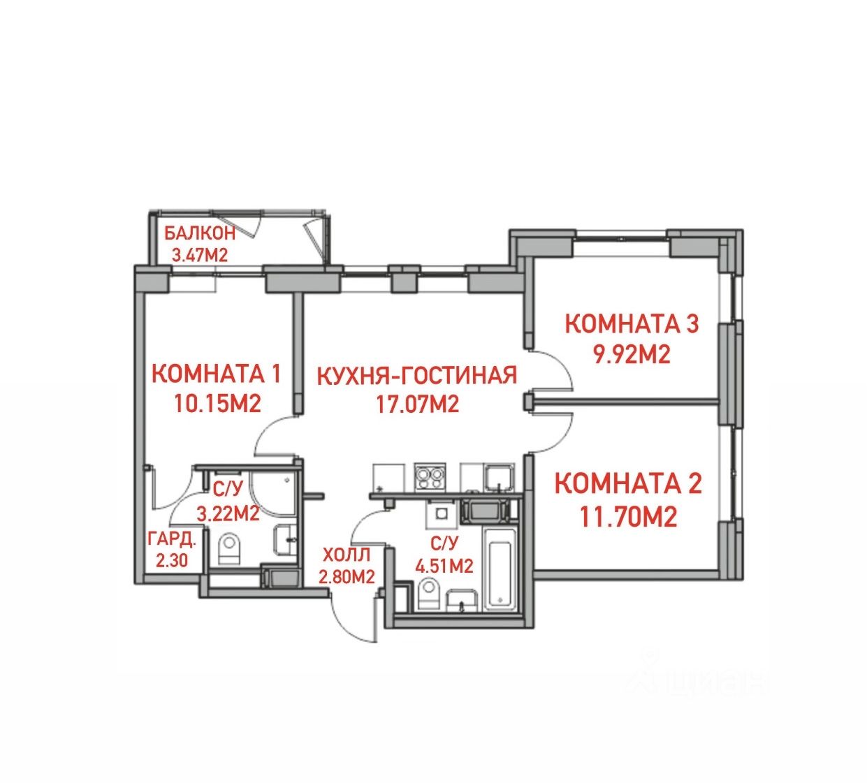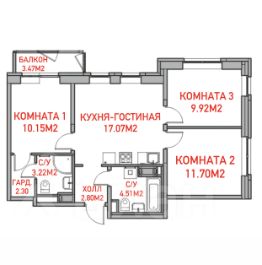 (Кухня: 17,07м2, Комнат 1: 10.15м2, Комната 2: 11,70м2, Комната 3: 9,92м2, С/у с Ванной 4.51 кв.м, С/у с душевой 3.22 кв.м, Гардеробная 2.30 кв.м., Холл 2.80 кв.м., Балкон 3,47 кв.м.)