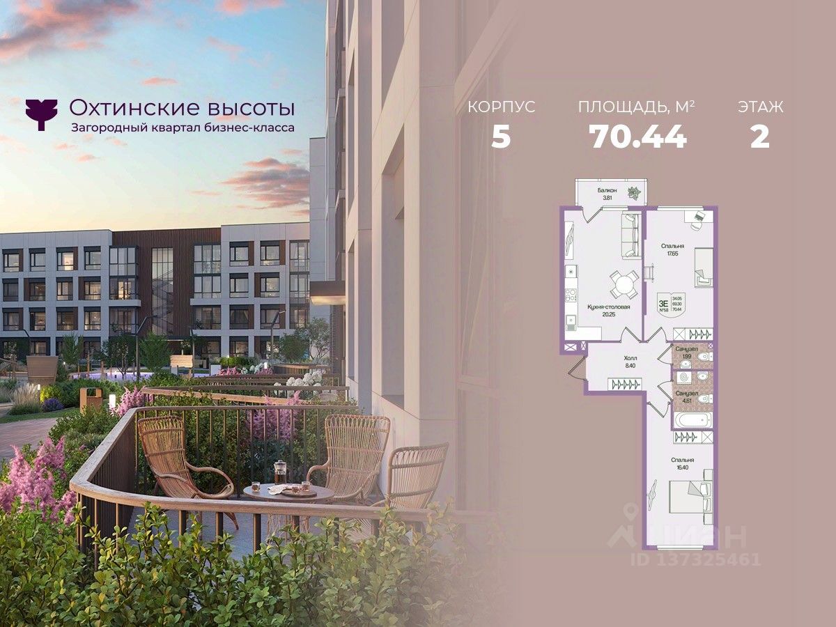 Загородный квартал бизнес-класса "Охтинские высоты" - это ваш новый образ жизни, в котором сбалансированы преимущества проживания на природе в сочетании с городскими сервисами. Квартал расположен рядом со всесезонным курортом Охта Парк, всего в 10 минутах от КАДа. В окружении расположены премиальные конные клубы, теннисные корты, банное пространство "Камыши". Также к услугам жителей легендарный лесной каток, теплый бассейн на открытом воздухе, SPA, рестораны и энотека Охта Парка, куда от квартала будет запущен шаттл только для жителей "Охтинских высот". Вокруг квартал рекреационная лесная зона невероятной красоты, буквально кислородная фабрика 24/7. Ко въезду ведет новая автомобильная дорога, специально построенная для комфорта будущих жителей "Охтинских высот". В первой очереди квартала уже реализуется детский сад на 120 мест. Запроектированы коммерческие помещения под аптеку, супермаркет, пункты выдачи заказов, кофейни и велнесс. Территория квартала безбарьерная. В каждом дворе будет выполнено уникальное благоустройство по авторскому проекту с детскими и спортивными площадками, местами для отдыха и активностей. Концепция озеленения выстроена по принципу "живописный двор круглый год". Любителям активного образа жизни особенно понравятся эксплуатируемые кровли с зонами для йоги и солярия, откуда открывается невероятный вид на зеленый лес, раскинувшийся вокруг квартала. Дворы закрытые, без машин. Безопасность жителей обеспечивает система круглосуточного наблюдения и охрана. Входные группы светопрозрачные, с увеличенными окнами "от колена". Вход с уровня земли. Жители всегда видят, что происходит во дворе и в парадной. МОПы отделами качественными материалами с фактурой дерева и камня. В каждой парадной современные грузопассажирские лифты, отдельно выделены колясочные и велосипедные. Квартал малоэтажный, всего 4 этажа. Высота потолков при этом от 3 м и выше. Квартиры спроектированы таким образом, чтобы закрыть потребности в ежедневном комфортном проживании для семей любого состава. В квартирах: • Живописные патио на первых этажах • Зоны для организации хранения • Мастер-спальни • Комнаты правильной формы • Просторные кухни-гостиные с комфортным зонированием • Гардеробные • Дополнительные санузлы • Увеличенные окна 2х2 м • Система управления комфортом в каждой квартире ("Умный дом") • Подготовка под установку кондиционера • Балконы и лоджии Все квартиры сдаются с отделкой white-box и Системой управления комфортом (умный дом). На выбор можно заказать чистовую отделку, которая представлена в двух вариантах.