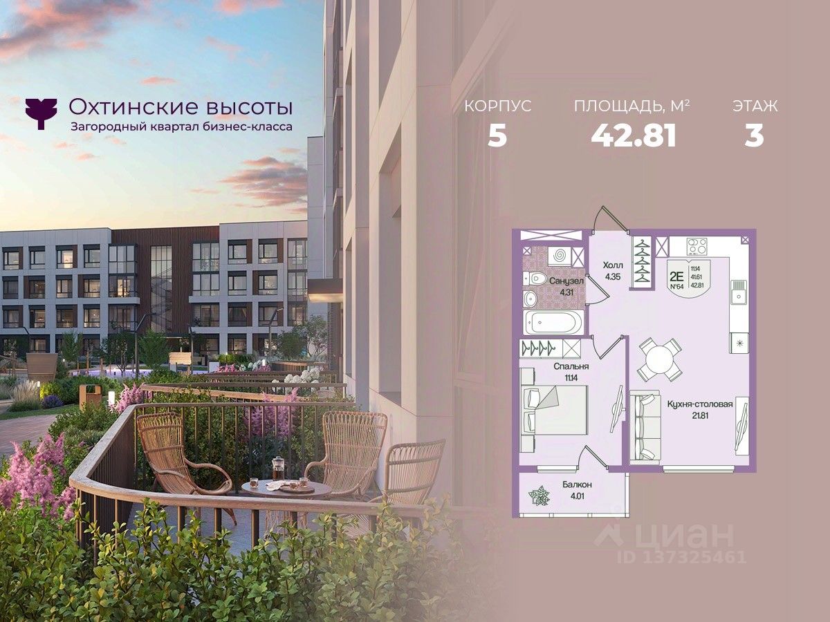 Загородный квартал бизнес-класса "Охтинские высоты" - это ваш новый образ жизни, в котором сбалансированы преимущества проживания на природе в сочетании с городскими сервисами. Квартал расположен рядом со всесезонным курортом Охта Парк, всего в 10 минутах от КАДа. В окружении расположены премиальные конные клубы, теннисные корты, банное пространство "Камыши". Также к услугам жителей легендарный лесной каток, теплый бассейн на открытом воздухе, SPA, рестораны и энотека Охта Парка, куда от квартала будет запущен шаттл только для жителей "Охтинских высот". Вокруг квартал рекреационная лесная зона невероятной красоты, буквально кислородная фабрика 24/7. Ко въезду ведет новая автомобильная дорога, специально построенная для комфорта будущих жителей "Охтинских высот". В первой очереди квартала уже реализуется детский сад на 120 мест. Запроектированы коммерческие помещения под аптеку, супермаркет, пункты выдачи заказов, кофейни и велнесс. Территория квартала безбарьерная. В каждом дворе будет выполнено уникальное благоустройство по авторскому проекту с детскими и спортивными площадками, местами для отдыха и активностей. Концепция озеленения выстроена по принципу "живописный двор круглый год". Любителям активного образа жизни особенно понравятся эксплуатируемые кровли с зонами для йоги и солярия, откуда открывается невероятный вид на зеленый лес, раскинувшийся вокруг квартала. Дворы закрытые, без машин. Безопасность жителей обеспечивает система круглосуточного наблюдения и охрана. Входные группы светопрозрачные, с увеличенными окнами "от колена". Вход с уровня земли. Жители всегда видят, что происходит во дворе и в парадной. МОПы отделами качественными материалами с фактурой дерева и камня. В каждой парадной современные грузопассажирские лифты, отдельно выделены колясочные и велосипедные. Квартал малоэтажный, всего 4 этажа. Высота потолков при этом от 3 м и выше. Квартиры спроектированы таким образом, чтобы закрыть потребности в ежедневном комфортном проживании для семей любого состава. В квартирах: • Живописные патио на первых этажах • Зоны для организации хранения • Мастер-спальни • Комнаты правильной формы • Просторные кухни-гостиные с комфортным зонированием • Гардеробные • Дополнительные санузлы • Увеличенные окна 2х2 м • Система управления комфортом в каждой квартире ("Умный дом") • Подготовка под установку кондиционера • Балконы и лоджии Все квартиры сдаются с отделкой white-box и Системой управления комфортом (умный дом). На выбор можно заказать чистовую отделку, которая представлена в двух вариантах.
