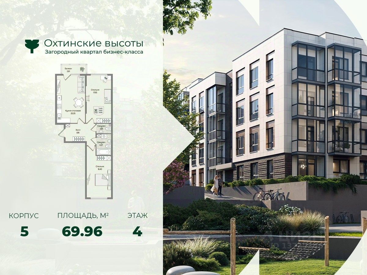 Загородный квартал бизнес-класса "Охтинские высоты" - это ваш новый образ жизни, в котором сбалансированы преимущества проживания на природе в сочетании с городскими сервисами. Квартал расположен рядом со всесезонным курортом Охта Парк, всего в 10 минутах от КАДа. В окружении расположены премиальные конные клубы, теннисные корты, банное пространство "Камыши". Также к услугам жителей легендарный лесной каток, теплый бассейн на открытом воздухе, SPA, рестораны и энотека Охта Парка, куда от квартала будет запущен шаттл только для жителей "Охтинских высот". Вокруг квартал рекреационная лесная зона невероятной красоты, буквально кислородная фабрика 24/7. Ко въезду ведет новая автомобильная дорога, специально построенная для комфорта будущих жителей "Охтинских высот". В первой очереди квартала уже реализуется детский сад на 120 мест. Запроектированы коммерческие помещения под аптеку, супермаркет, пункты выдачи заказов, кофейни и велнесс. Территория квартала безбарьерная. В каждом дворе будет выполнено уникальное благоустройство по авторскому проекту с детскими и спортивными площадками, местами для отдыха и активностей. Концепция озеленения выстроена по принципу "живописный двор круглый год". Любителям активного образа жизни особенно понравятся эксплуатируемые кровли с зонами для йоги и солярия, откуда открывается невероятный вид на зеленый лес, раскинувшийся вокруг квартала. Дворы закрытые, без машин. Безопасность жителей обеспечивает система круглосуточного наблюдения и охрана. Входные группы светопрозрачные, с увеличенными окнами "от колена". Вход с уровня земли. Жители всегда видят, что происходит во дворе и в парадной. МОПы отделами качественными материалами с фактурой дерева и камня. В каждой парадной современные грузопассажирские лифты, отдельно выделены колясочные и велосипедные. Квартал малоэтажный, всего 4 этажа. Высота потолков при этом от 3 м и выше. Квартиры спроектированы таким образом, чтобы закрыть потребности в ежедневном комфортном проживании для семей любого состава. В квартирах: • Живописные патио на первых этажах • Зоны для организации хранения • Мастер-спальни • Комнаты правильной формы • Просторные кухни-гостиные с комфортным зонированием • Гардеробные • Дополнительные санузлы • Увеличенные окна 2х2 м • Система управления комфортом в каждой квартире ("Умный дом") • Подготовка под установку кондиционера • Балконы и лоджии Все квартиры сдаются с отделкой white-box и Системой управления комфортом (умный дом). На выбор можно заказать чистовую отделку, которая представлена в двух вариантах.