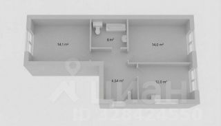 Планировка: просторный коридор квадратной формы (9,54 кв. м), большая кухня (12 кв. м) и две комнаты — 14,1 и 14 кв. м.