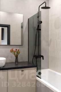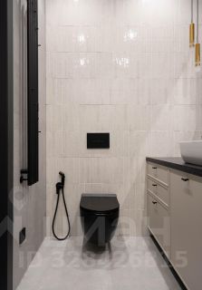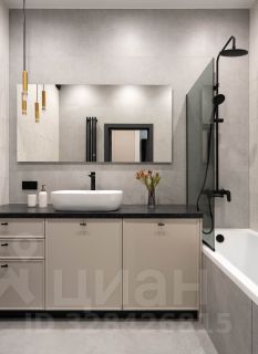 - Просторный санузел. Ванная с тропическим душем, большое зеркало с подсветкой, раковина с вместительной тумбой для хранения и встроенной стиральной машиной, инсталляция, тёплый пол, полотенцесушитель.