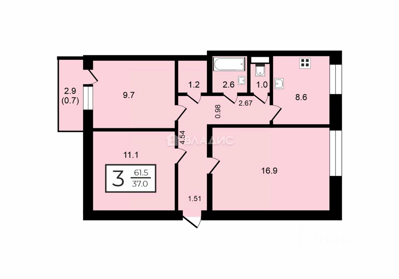- Общая площадь: 61,5 кв. м.