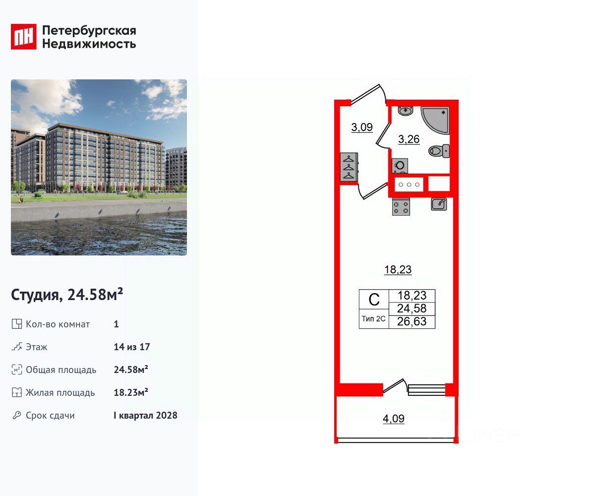 Удобная, классическая, функциональная европланировка, вместительная прихожая 3.09 м². Общая площадь студии - 24.58 м², жилая 18.23 м², высота потолка 2.77 м.