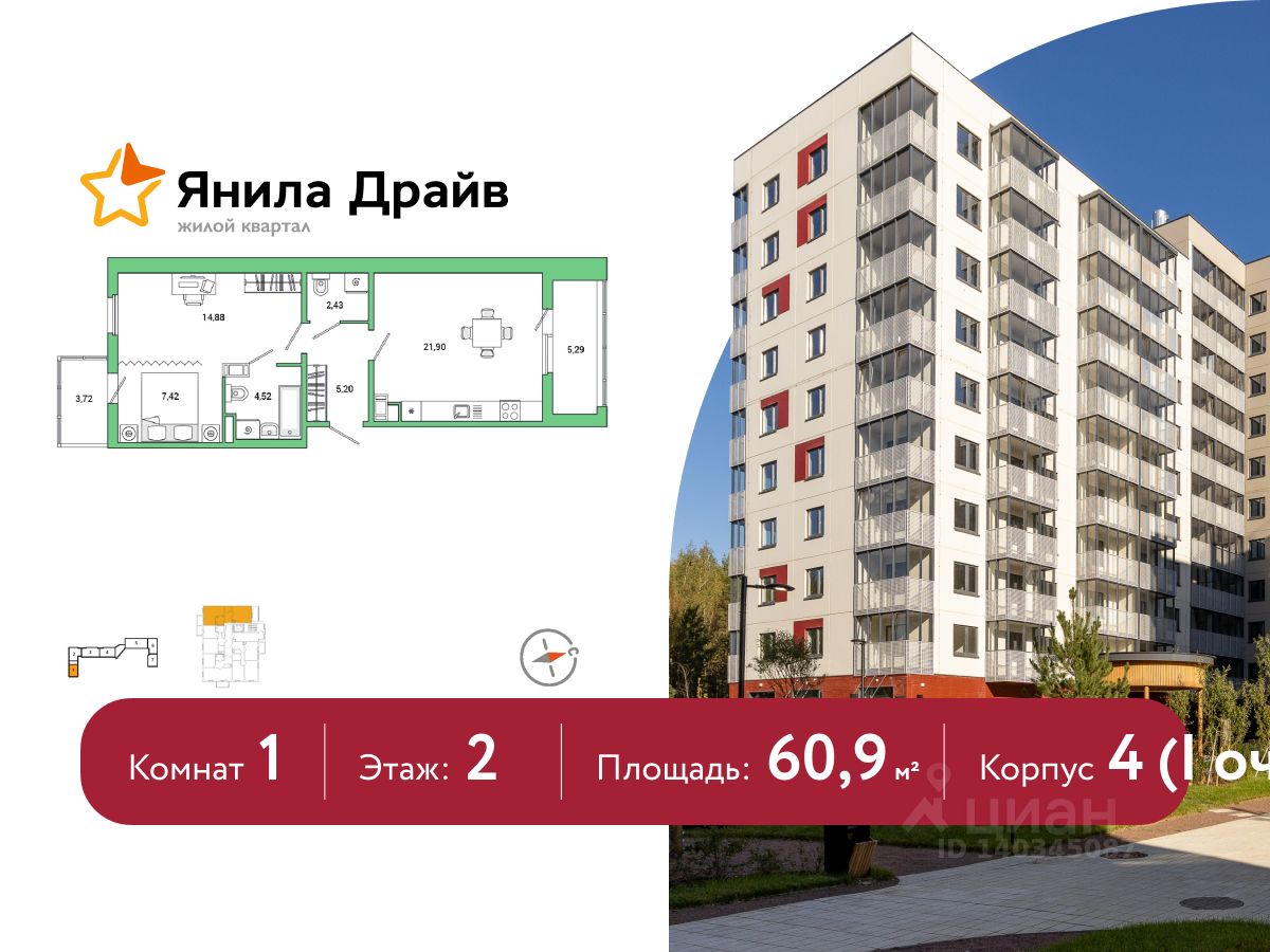 Продается квартира в ЖК Янила Драйв общей площадью 60.90 м2. Кухня - 21.90 м2, жилая площадь - м2