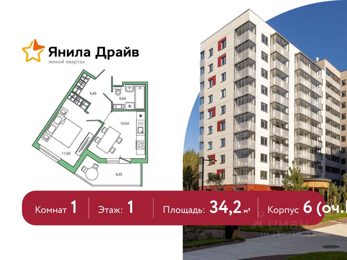 Продается квартира в ЖК Янила Драйв общей площадью 34.20 м2. Кухня - 10.54 м2, жилая площадь - 11.65 м2