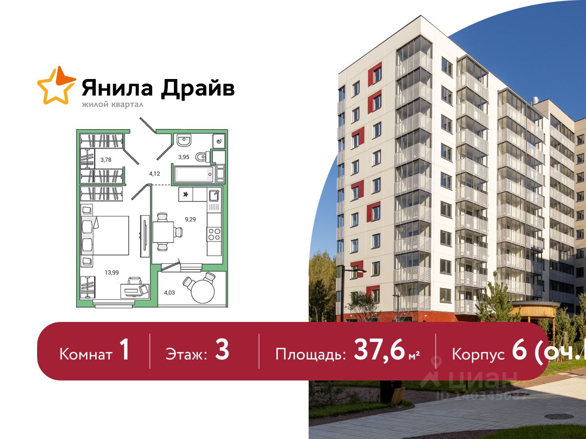 Продается квартира в ЖК Янила Драйв общей площадью 37.60 м2. Кухня - 9.29 м2, жилая площадь - 13.99 м2