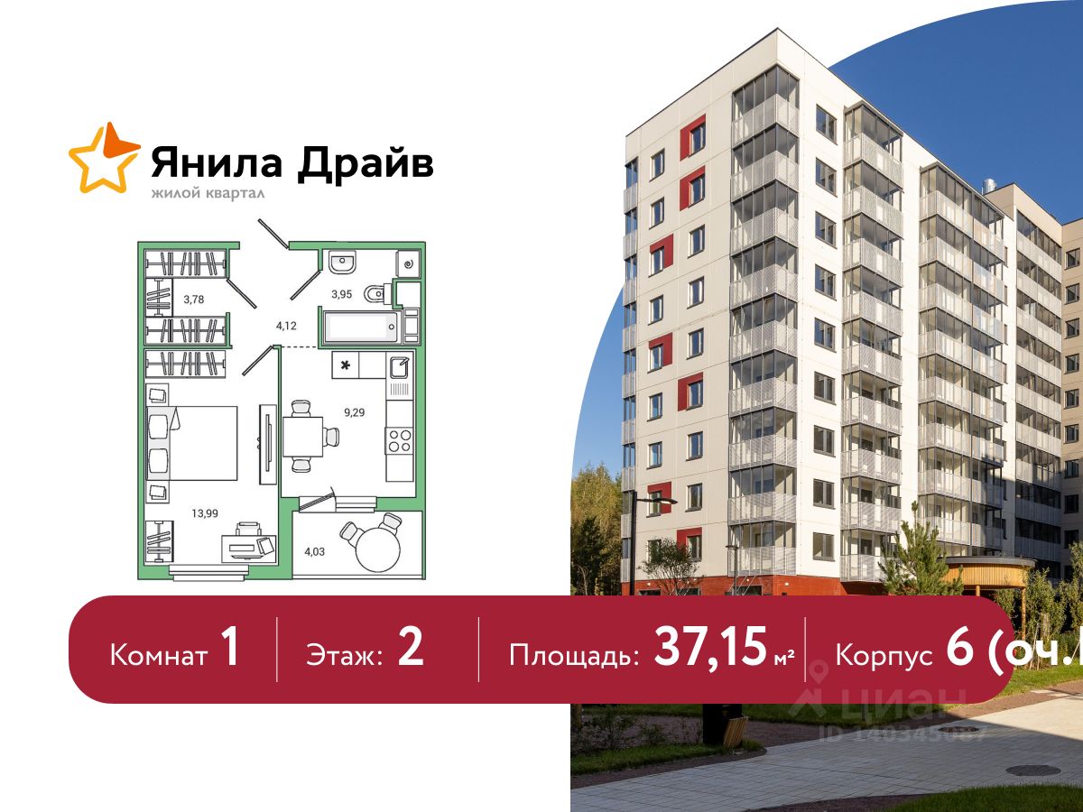 Продается квартира в ЖК Янила Драйв общей площадью 37.15 м2. Кухня - 9.29 м2, жилая площадь - 13.99 м2