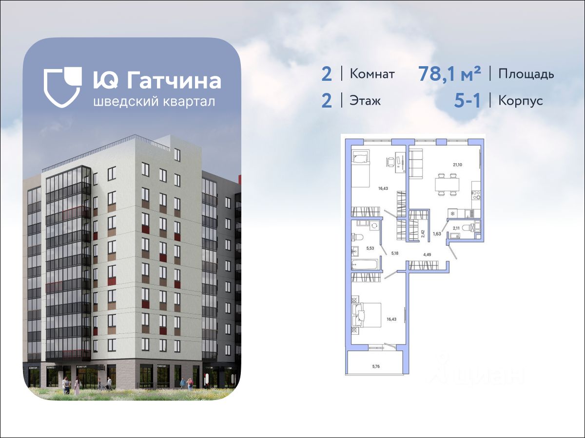 IQ Гатчина- жилой квартал комфорт -класса, в историческом пригороде Санкт-Петербурга городе Гатчина. Концепцию создания комплекса разрабатывало шведское архитектурное бюро Йоханнеса Товатта с европейским подходом к каждой детали. Транспортная доступность: 20 мин. на авто до КАД, 30 мин. до метро "Московская" и не больше часа до центра Санкт-Петербурга. В шаговой доступности от комплекса парки Гатчинского дворца, остановки общественного транспорта, а также ж/д станция "Татьянино". О проекте: комплекс имеет переменную высотность от 5-12 этажей, яркие фасады и безбарьерную среду. Места общего пользования выполнены по дизайн проекту, с современными бесшумными лифтами, колясочными и витражным остеклением. Все комнаты правильной квадратной формы, увеличенные окна с двойными стеклопакетами, высота потолков от 2,7 м2 до 3,02 м2 на последних этажах. Инфраструктура: на первых этажах комплекса работают супермаркеты, аптеки, салоны красоты и уютные кафе, прямо напротив жилого комплекса - крупный торговый центр. В квартале уже открыла свои двери современная школа на 825 мест и детский сад на 120 мест, а также в ближайшее время запланировано строительство второго детского сада. Благоустройство: квартал полностью имеет закрытые дворы, в которых каждый чувствует себя максимально безопасно, работает круглосуточное видеонаблюдение, доступ только для жителей и их гостей по системе IP домофония, концепция "дворы без машин", зеленые аллеи, ландшафтное озеленение, во дворах установлены современные игровые комплексы, спортивные площадки. Для владельцев животных предусмотрены лапамойки. Уникальный образовательный кластер: Гатчинский государственный университет (ГГУ), Государственный институт экономики, финансов, права и технологий, "Гатчинский педагогический колледж имени К.Д. Ушинского", ЧОУ "Первая академическая гимназия", МБОУ СОШ No12 "Центр образования", Детские сады No26 и No52 Первый дома комплекса уже сданы и заселены. В комплексе так же работает "Живи клуб", который объединяет жителей общими идеями и хобби.