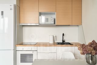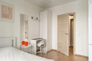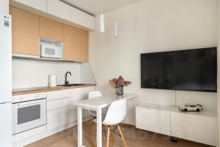 Комната площадью 18 кв.м ощущается просторно за счет высокого потолка 2.7м. Реализовано несколько сценариев освещения. Оборудована полноценная кухня с обеденной зоной. Рабочее место, двуспальная кровать с расположенным напротив телевизором есть место для приставок и прочего.