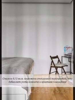 Спальня 8,72 м², которая огорожена стеклянной перегородкой.