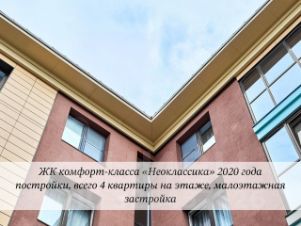 ЖК комфорт-класса Неоклассика 2020 года постройки, в состав которого входят три четырехэтажных монолитно-каркасных дома. В ЖК по 4 квартиры на этаж, с просторными мопами и грузовыми лифтами Otis. Комплекс входит в состав микрорайона На Царскосельских холмах.