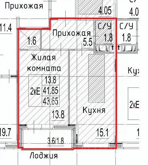 Общая площадь — 42,2 м² + лоджия 3,6 м²