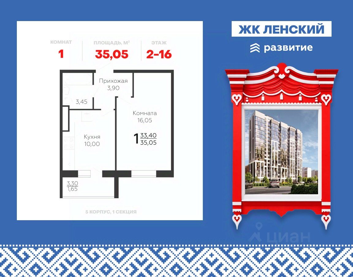 Продается 1-комнатная квартира 35,05 кв.м. на 16 этаже. В продаже квартира в жилом комплексе комфорт-класса "Ленский".