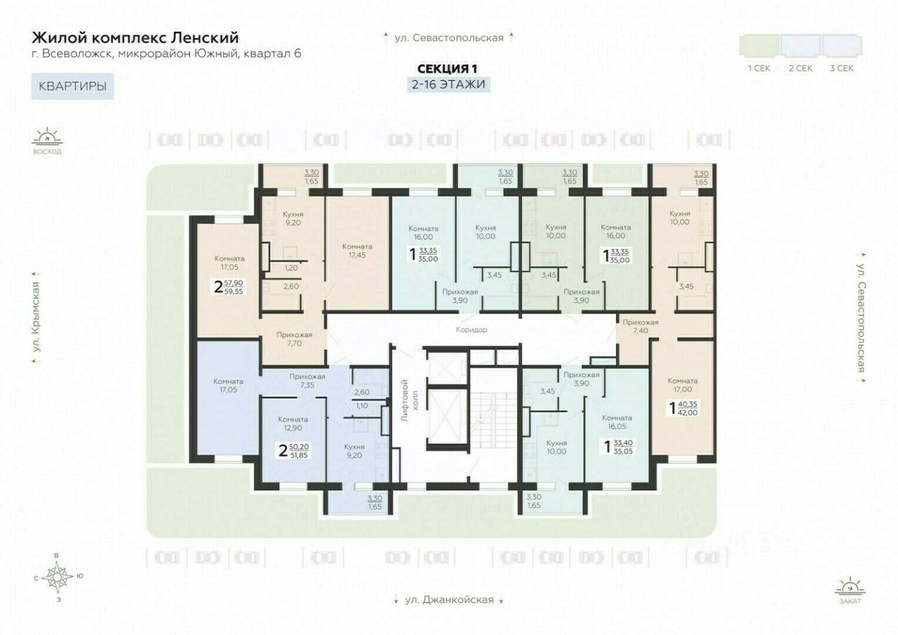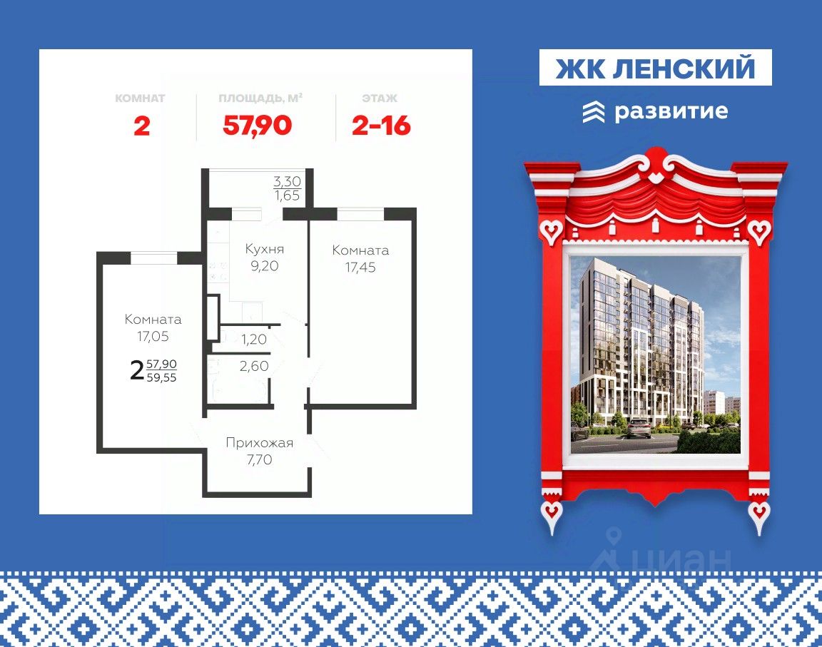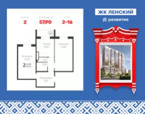 Продается 2-комнатная квартира 59,55 кв.м. на 15 этаже. В продаже квартира в жилом комплексе комфорт-класса "Ленский".