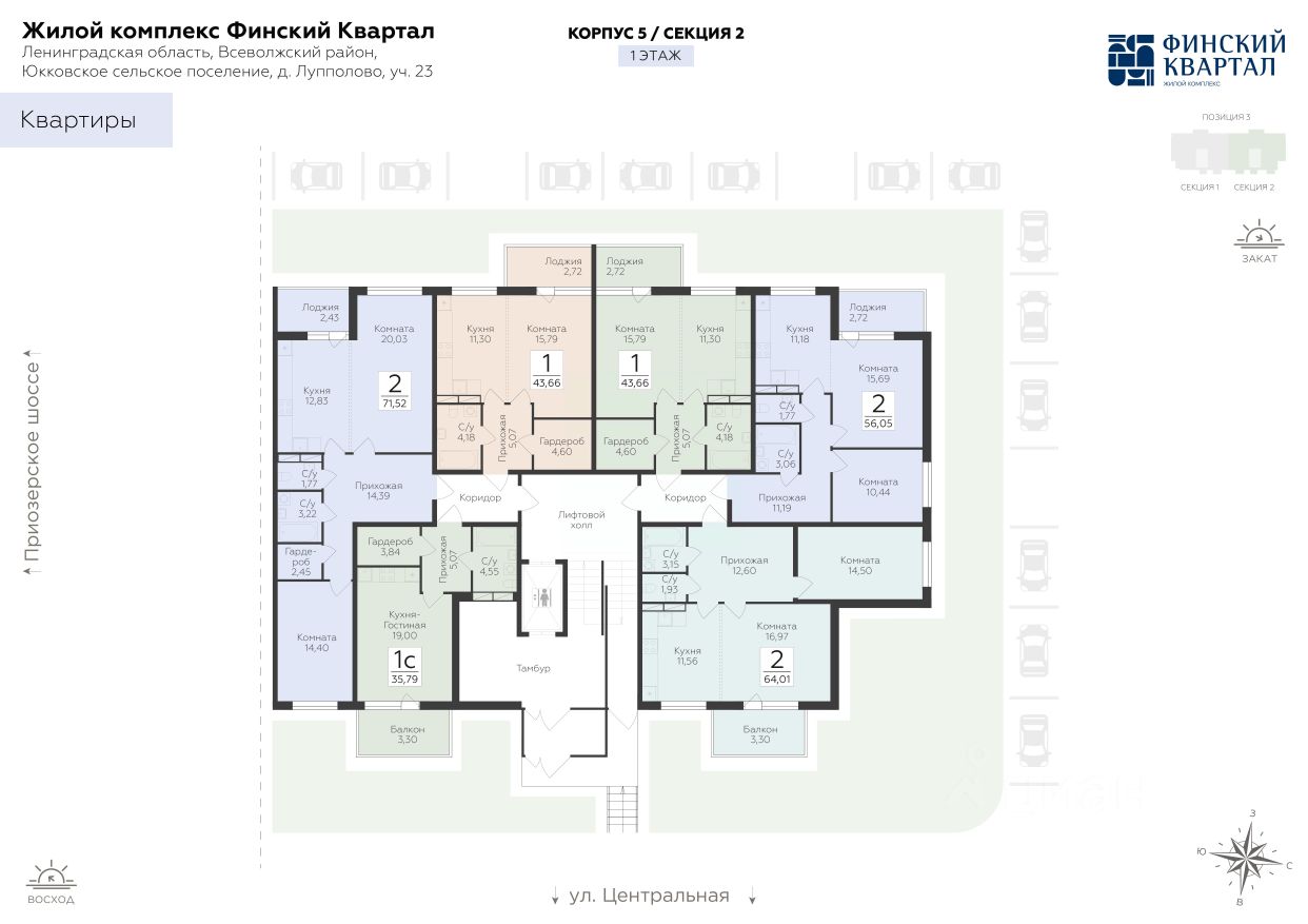 Продается 2-комнатная квартира 56,05 кв.м. на 5 этаже. В продаже квартира в жилом комплексе комфорт-класса "Финский квартал".