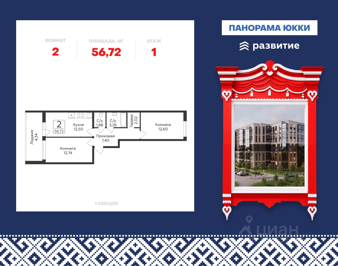 Продается 2-комнатная квартира 56,72 кв.м. на 1 этаже. В продаже квартира в жилом комплексе комфорт-класса "Панорама Юкки".