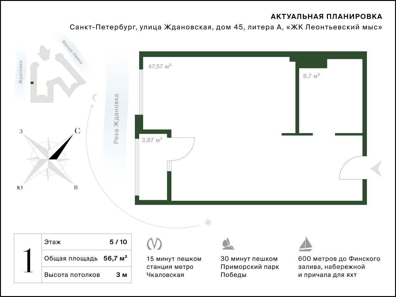 Расположение сочетает близость к ключевым точкам города с редкой транспортной доступностью. До Крестовского острова — 7 минут пешком, до Елагина острова — 10 минут на машине, до Невского проспекта — 13 минут, до ЗСД — 7 минут.