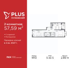 Двухкомнатная квартира от застройщика с отделкой в ЖК "PLUS Пулковский" на 5 этаже. Общая площадь: 57.59 кв.м., жилая: 30.4 кв.м., площадь просторной кухни-столовой: 12 кв.м. Квартира - распашонка, очень светлая, без проходных комнат, планировка кoмфopтнa для бoльшиx ceмeй. В квартире один балкон и одна лоджия, один совмещенный и один раздельный санузел. Высота потолков 2.89 м.