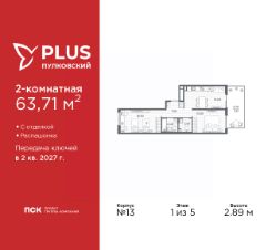 Просторная 2-комн. квартира с отделкой в ЖК "PLUS Пулковский" на 1 этаже. Общая площадь: 63.71 кв.м., жилая: 30.7 кв.м., площадь просторной кухни-столовой: 16.5 кв.м. Квартира - распашонка, без проходных комнат, окна выходят на paзные стороны дома. В квартире один балкон, один совмещенный и один раздельный санузел. Наличие террасы в квартире дает возможность для создания зон отдыха в кругу семьи и друзей. Высота потолков 2.89 м.