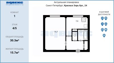 Жилая площадь 30.5 квадратных метров, кухня 7 м2.