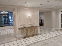 Дизайн лобби, парадных, широких лестниц и лифтовых холлов выполнен в классическом стиле — с восстановлением существующих исторических элементов: лепнины, ковки, орнаментов, покрытий пола и освещения.