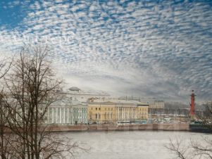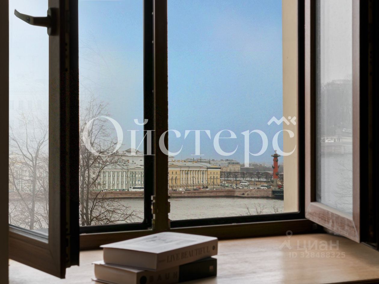 Из окон открывается великолепный вид на Неву, Стрелку Васильевского острова с Ростральными колоннами и Дворцовый мост — один из уникальных петербургских пейзажей.
