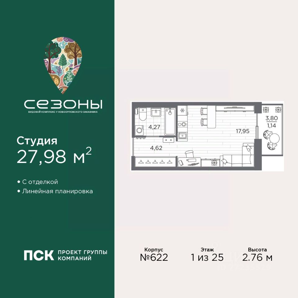 Просторная однокомнатная квартира-студия с отделкой в ЖК "Сезоны" на 1 этаже. Общая площадь: 27.98 кв.м., площадь гостиной 17.95 кв.м., из которых 5 кв.м. выделено под кухонную зону. Все окна выходят на одну сторону. В квартире один балкон, один совмещенный санузел. Высота потолков 2.76 м.