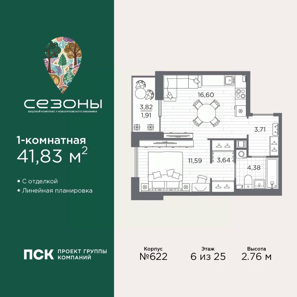 Продается 1-комн. квартира с отделкой в ЖК "Сезоны" на 6 этаже. Общая площадь: 41.83 кв.м., жилая: 11.59 кв.м., площадь просторной кухни-столовой: 16.6 кв.м. Все окна выходят на одну сторону. В квартире одна лоджия, один совмещенный санузел. Высота потолков 2.76 м.