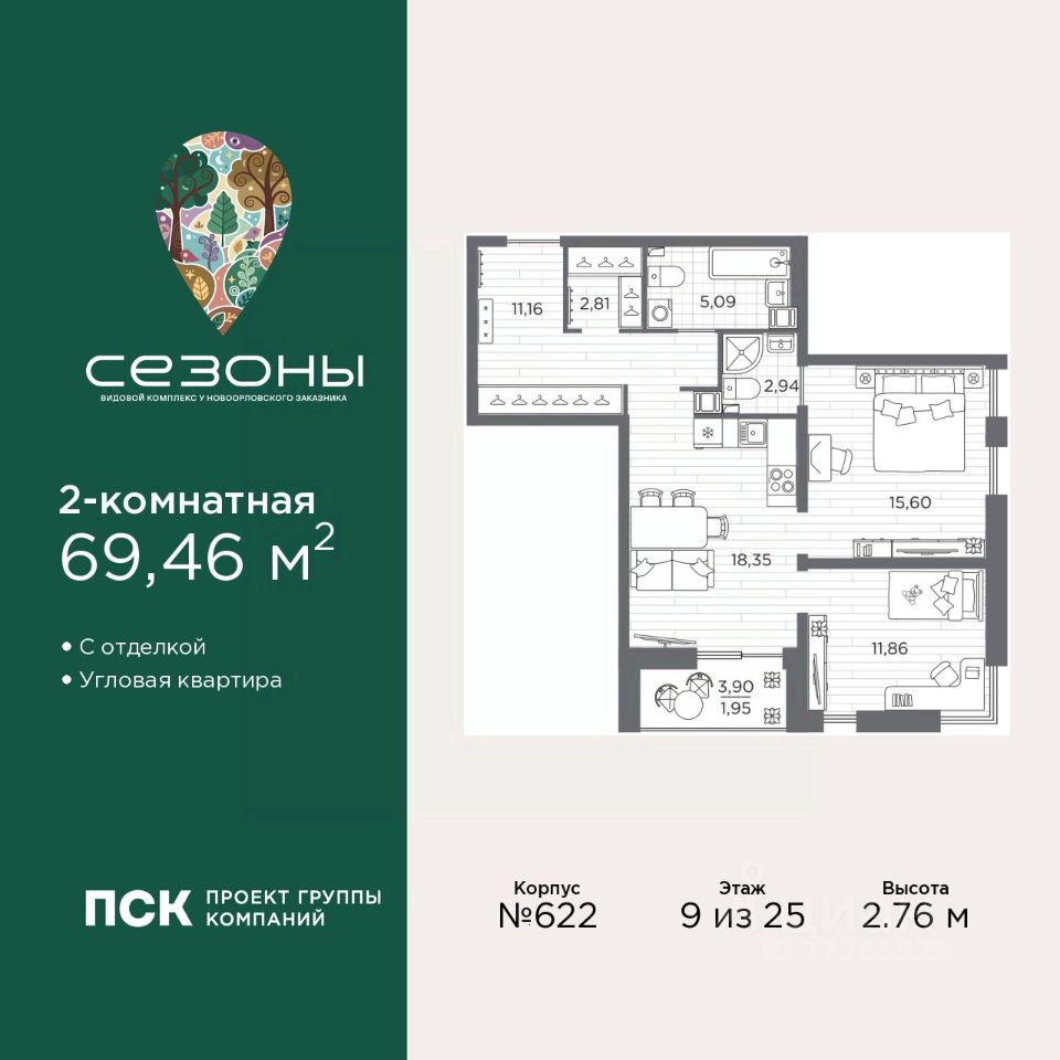 Двухкомнатная квартира с отделкой в ЖК "Сезоны" на 9 этаже. Общая площадь: 69.46 кв.м., жилая: 27.46 кв.м., площадь просторной кухни-столовой: 18.35 кв.м. Квартира угловая, окна oбecпeчивaют paвнoмepнoe ocвeщeниe в тeчeниe дня. В квартире одна лоджия, два совмещенных санузла. Высота потолков 2.76 м.