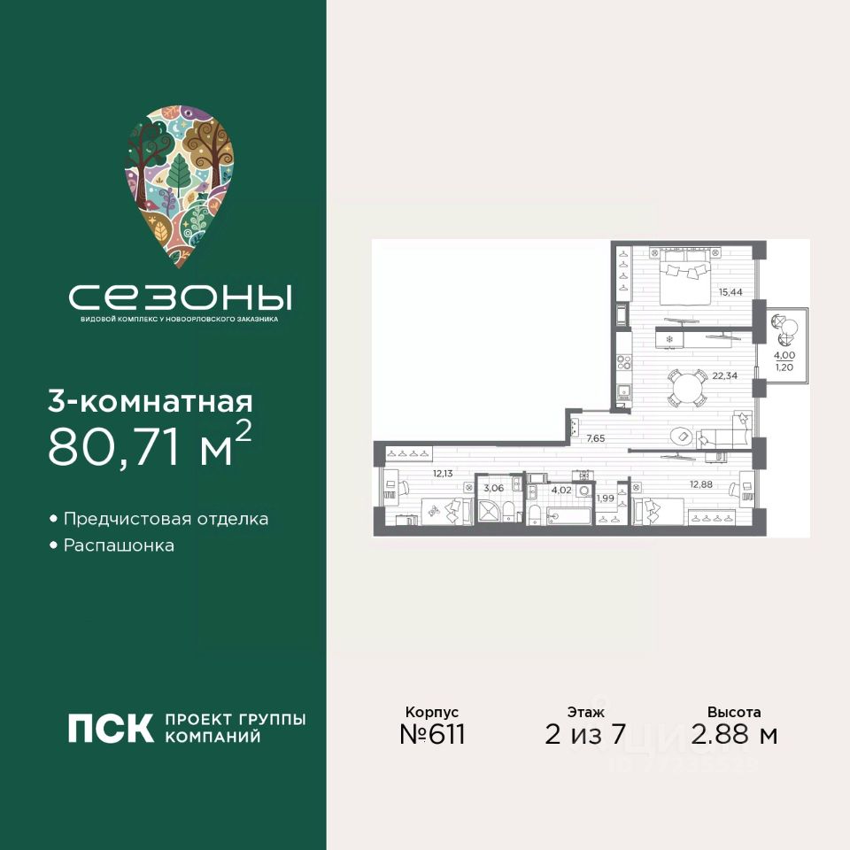 Трехкомнатная квартира от застройщика с предчистовой отделкой в ЖК "Сезоны" на 2 этаже. Общая площадь: 80.71 кв.м., жилая: 40.45 кв.м., площадь просторной кухни-столовой: 22.34 кв.м. Квартира - распашонка, без проходных комнат, окна выходят на paзные стороны дома. В квартире один балкон, два совмещенных санузла. Высота потолков 2.88 м.
