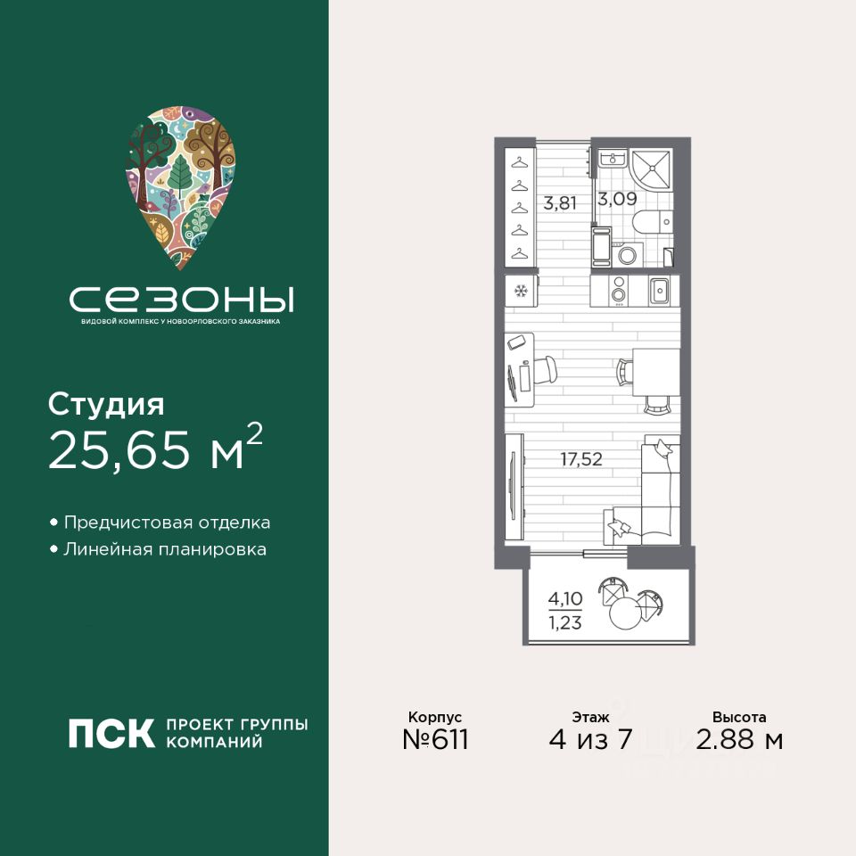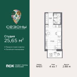 Продается однокомнатная квартира-студия от застройщика с предчистовой отделкой в ЖК "Сезоны" на 4 этаже. Общая площадь: 25.65 кв.м., площадь гостиной 17.52 кв.м., из которых 5 кв.м. выделено под кухонную зону. Все окна выходят на одну сторону. В квартире один балкон, один совмещенный санузел. Высота потолков 2.88 м.