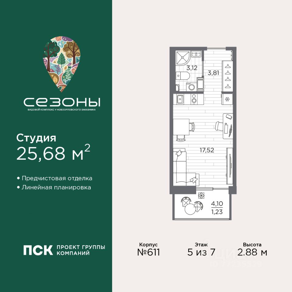 Просторная 1-комн. квартира-студия с предчистовой отделкой в ЖК "Сезоны" на 5 этаже. Общая площадь: 25.68 кв.м., площадь гостиной 17.52 кв.м., из которых 5 кв.м. выделено под кухонную зону. Все окна выходят на одну сторону. В квартире один балкон, один совмещенный санузел. Высота потолков 2.88 м.